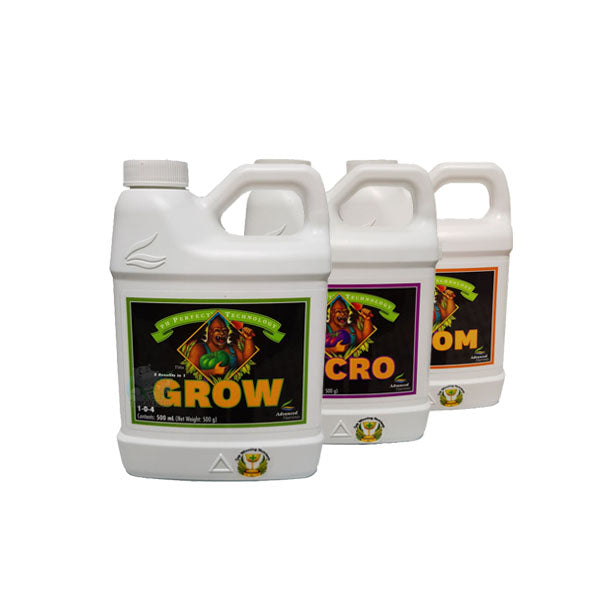 Advanced Nutrients Grow,Micro ve Bloom bitkilere filizden hasata kadar olan dönemlerde optimum beslenme sağlayan üçlü bir sıvı gübredir. Bitkilerde hızlı büyüme, yüksek verim ve üst kalite ürünler almanıza yardımcı olur. pH Perfect teknolojisi sayesinde, solüsyonunuzu en uygun ph oranında tutar. Bitkinin yeşil kısımların ve yaprakların büyümesini sağlar. Büyüme dönemindeki ihtiyacı olan bütün besinleri içerir.