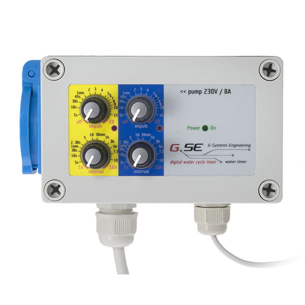 GSE sulama zamanlayıcısı, bitkileri istenilen aralıklarda sulamak, pompaları kontrol etmek için kullanılır. Tüm hidroponik sistemlerde ve damla sulama sistemlerinde kullanılır. Sulama süresi ve aralığı, gündüz ve gece sulama için ayrı ayrı ayarlanabilir. Su geçirmezdir, yüksek nemli odalarda kullanılabilir. Hassas sulama zamanları olan bitkiler için mükemmel çözümdür.