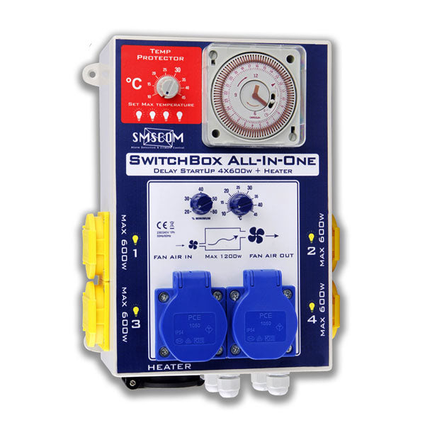 Hollanda menşei SMSCOM zamanlayıcı ve fan kontrolör, lambaların istenilen saatlerde açılıp kapanmasını ve odanın istenilen sıcaklıkta kalması için gereken fanın gerekli devirde çalışmasını sağlayan kontrol cihazıdır. Cihaz lambaların ve yetiştirme odasındaki ısıtıcının istenilen zamanda açılıp kapanmasını sağlar ve ayrıca yetiştirme odasındaki fanların odanın ideal sıcaklıkta tutulması için uygun hızda çalışmasını koordine eder. Cihaza dört adet 600w lamba bağlanabilir. Cihazda fan ve lambaların kontrolüne ek olarak, güvenlik tedbiri olarak odanın aşırı ısınması durumunda lambaların kapatılması özelliği de vardır. Temp Protector bölümünden odadaki maksimum sıcaklık sınırı seçilir.Odadaki sıcaklık belirlenen değerin üzerine çıktığında, sadece bir lamba açık kalacak şekilde odadaki diğer lambalar cihaz tarafından kapatılır. 30 dakika sonra cihaz kapatılan lambaları tekrar devreye sokar. Odadaki sıcaklık ne olursa olsun bir lamba yanmaya devam eder. Cihazda ayrıca lambaların gecikmeli yanması da sağlanabilir ve böylelikle elektrik tesisatına anlık olarak fazla akım yüklenmez. Her bir lamba belirlenen zamanda aynı anda yanar veya isteğinize göre belirli gecikmelerle (örneğin 15 dakika arayla ) çalışacak şekilde ayarlanabilir.